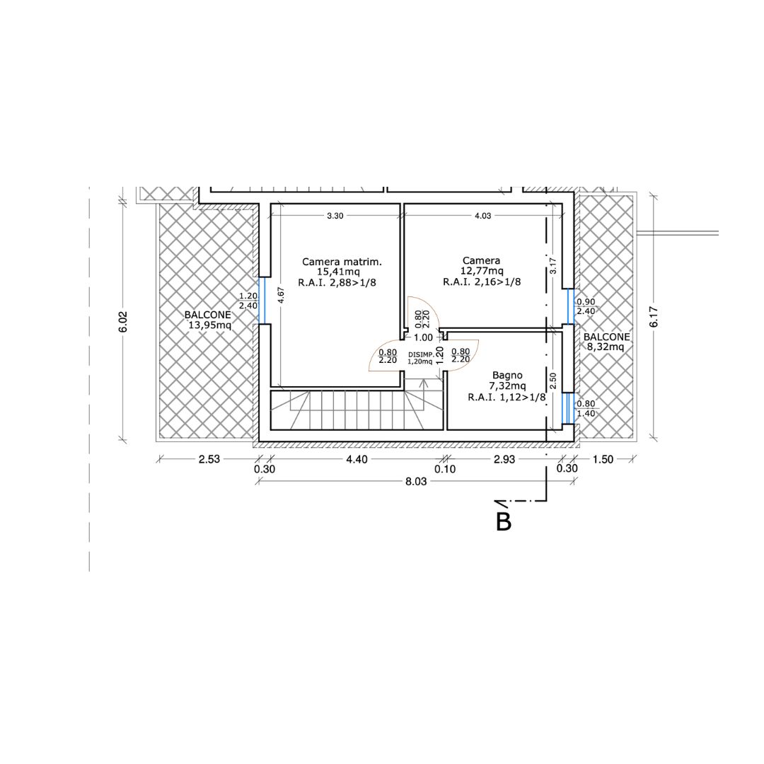 - Piano primo: due camere da letto, entrambe con accesso a un balcone privato di rispettivamente 8 mq e 14mq, ed bagno finestrato